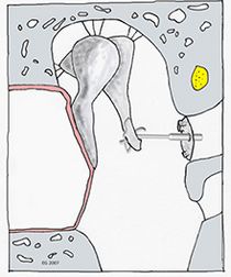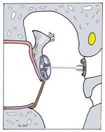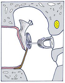Stapedotomie mit Eintauchen einer am langen Ambossschenkel fixierten Clip-Prothese (aus Titan) in den Vorhof (= Vestibulum) des Innenohres.