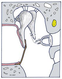 Tympanoplastik Typ I mit Unterfütterung des Trommeldefektes (braun) mit Muskelhaut ( = Faszie) oder Knorpelhaut (= Perichondrium)